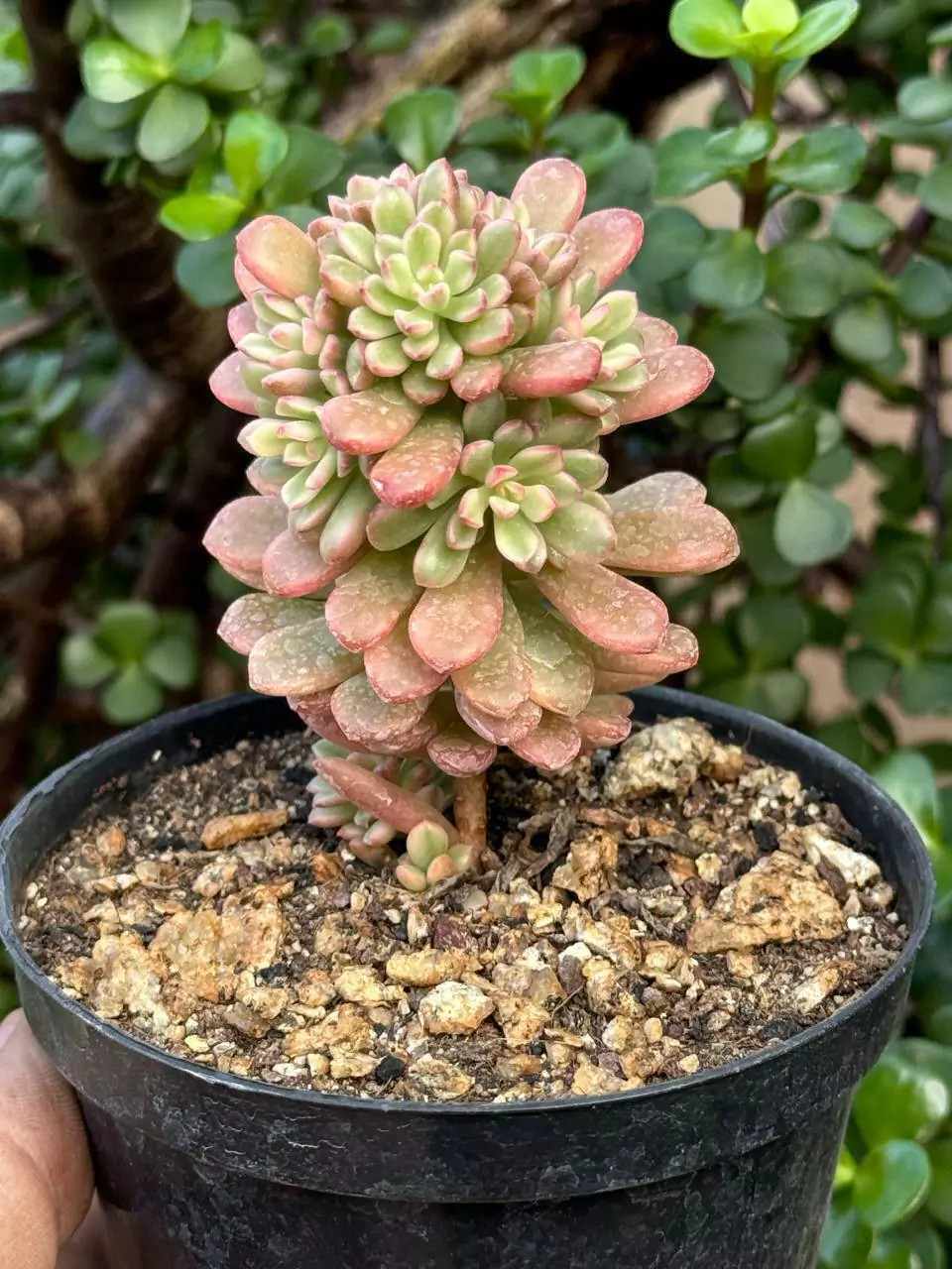 A Sedum ‘Joyce Tulloch’ Variegata é uma suculenta rara e encantadora, conhecida por suas folhas espatuladas com variação de tons entre o verde-claro, creme e, em alguns casos, bordas rosadas quando exposta ao sol. Compacta e ornamental, é perfeita para composições delicadas, vasos pequenos ou coleções especiais.